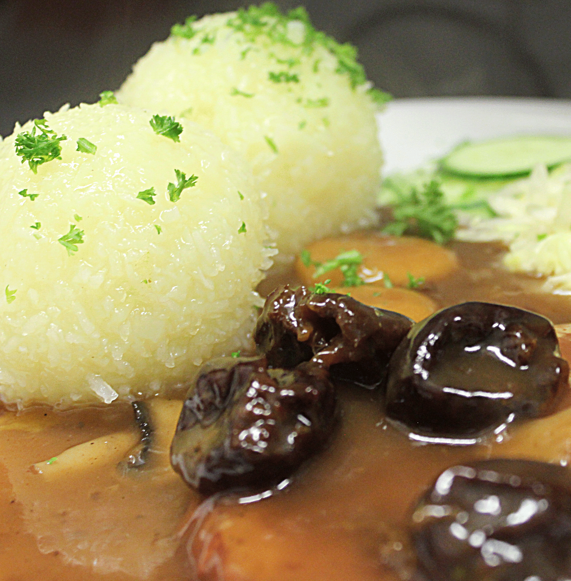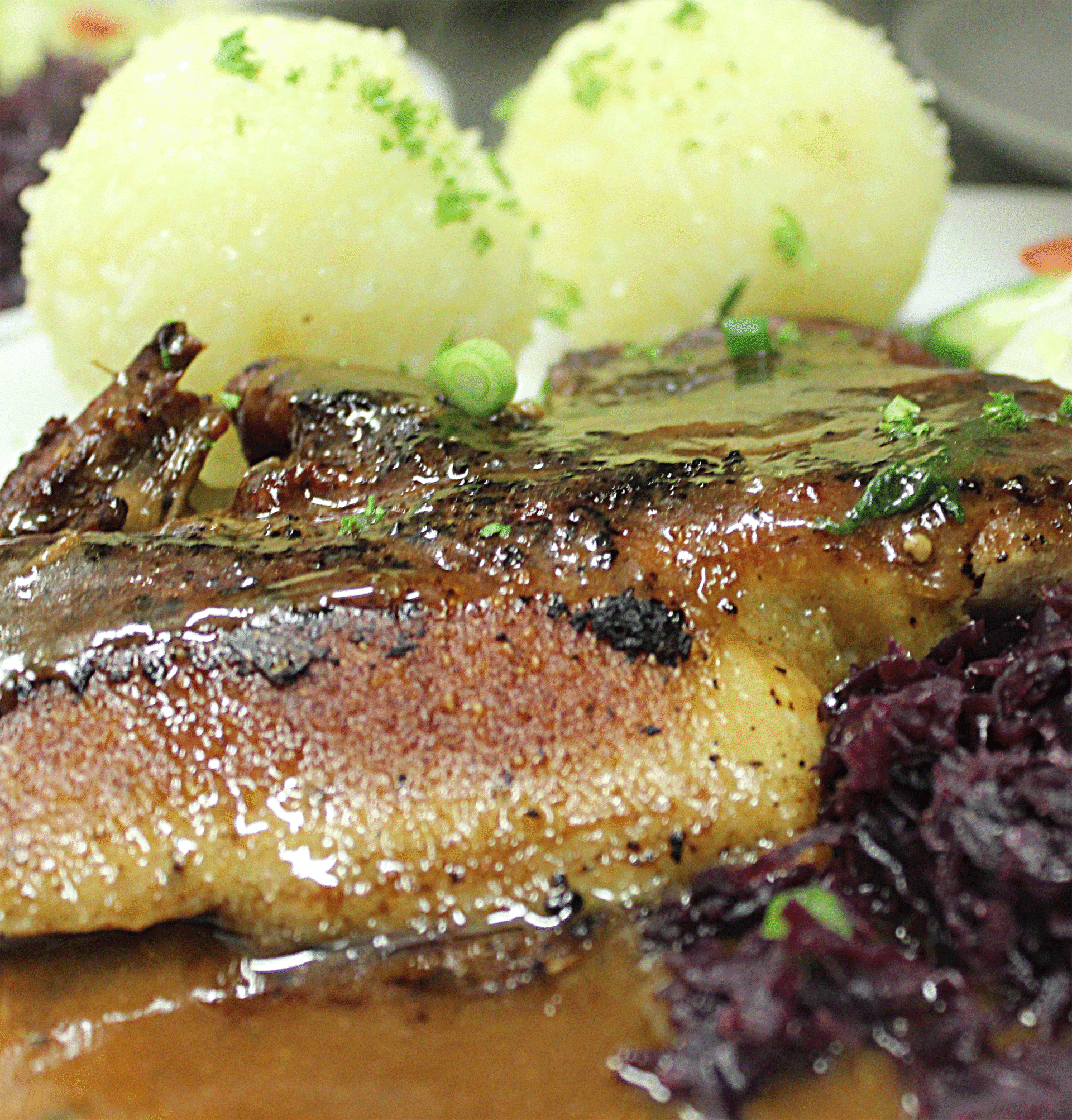 Kaßlerscheiben mit Backobst in süßsaurer Sauce und dazu Semmelknödel